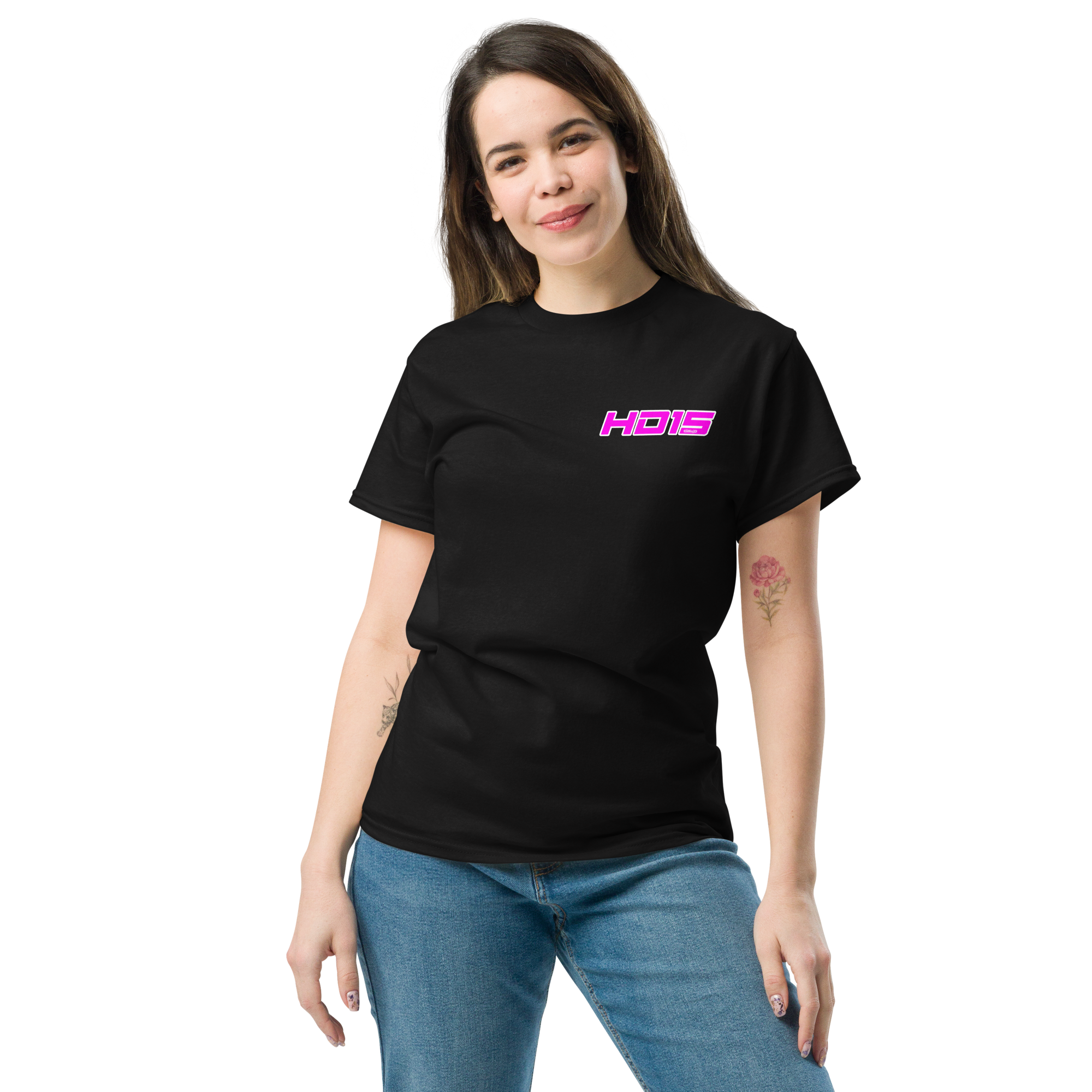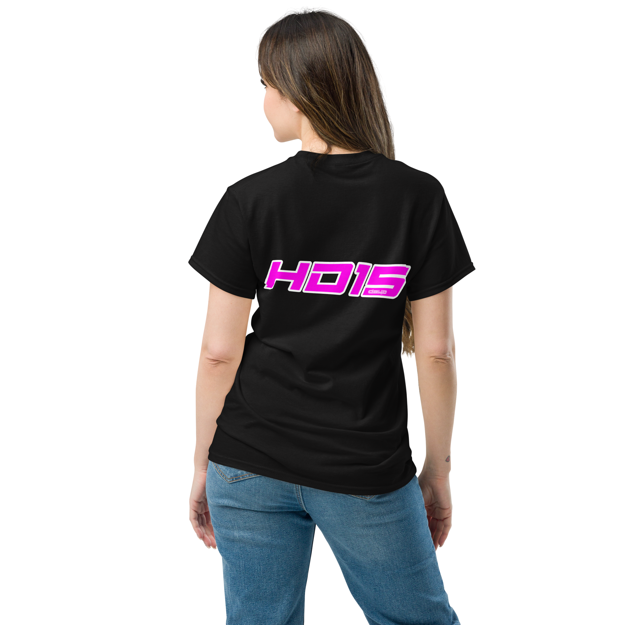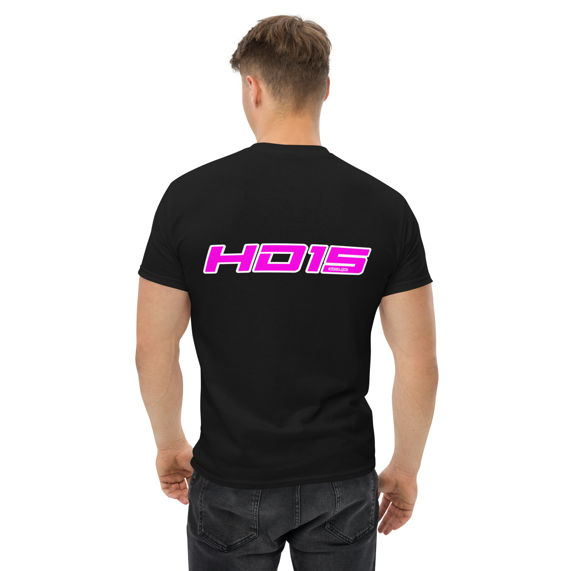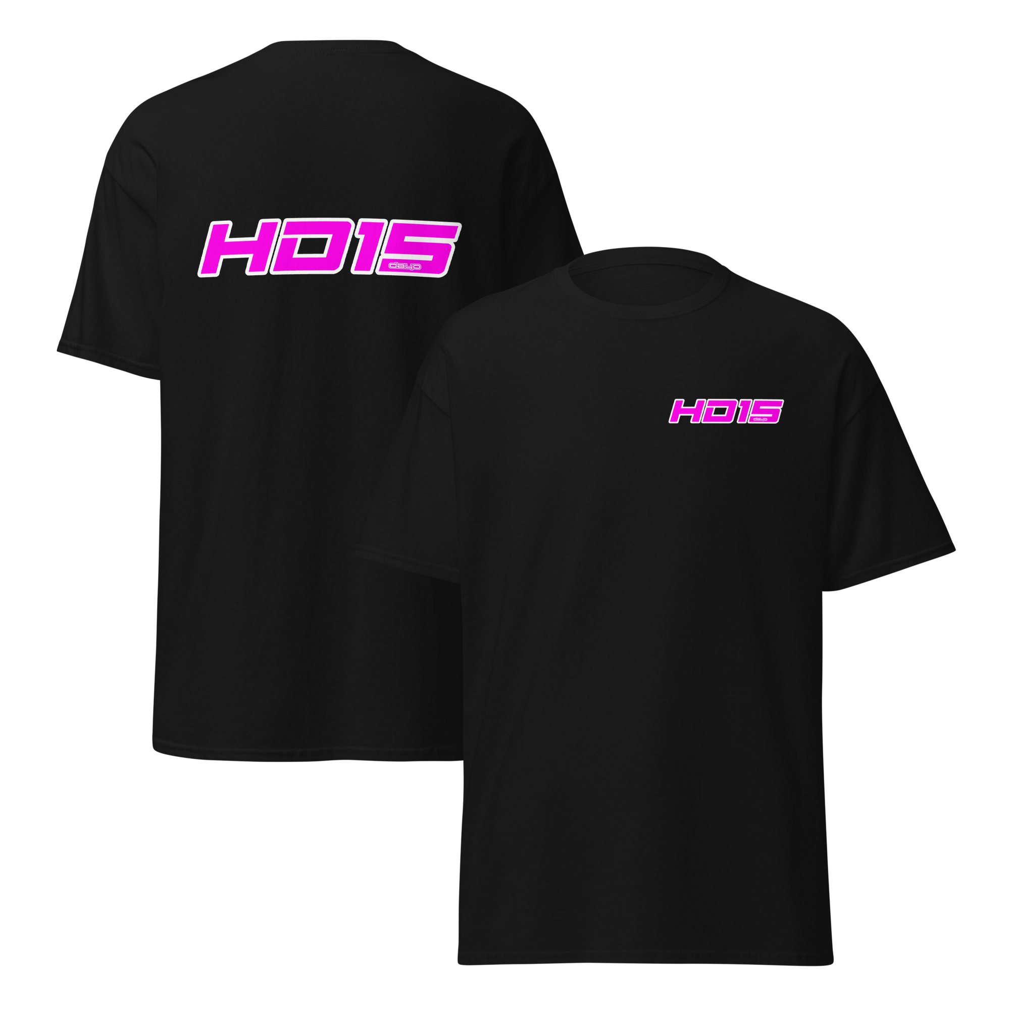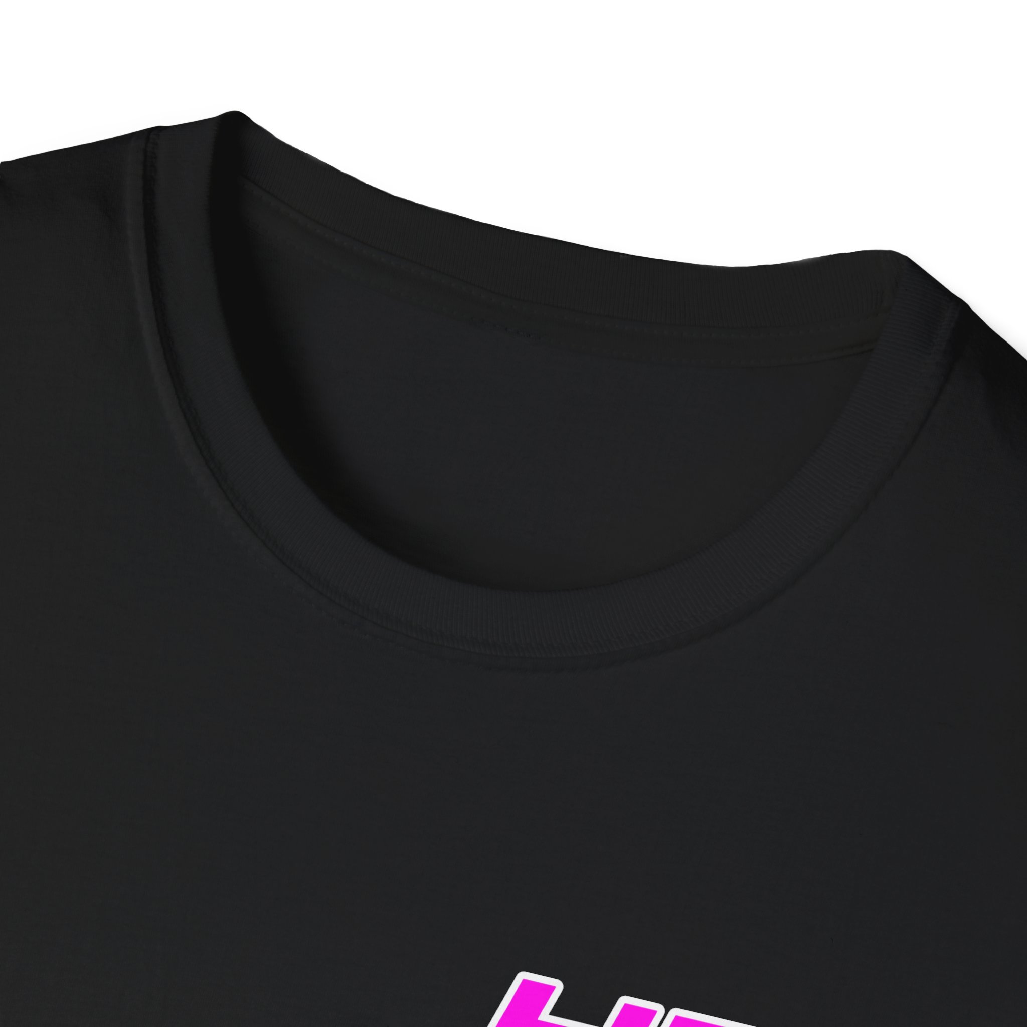 This black cotton tee carries a bold, retro-futuristic logo in neon pink on the chest and a larger matching mark across the back. It reads like a club patch from a midnight drive—clean lines, high-contrast color, and just enough attitude to stand out without shouting. Wear it to late-night meetups, music runs, or while tinkering on a project; the lightweight ring-spun cotton and classic crew cut keep you comfortable while the bright graphic does the talking. The feel is casual, confident, and slightly nostalgic—like fast beats, glowing signs, and friendships forged under streetlights.